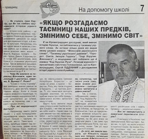 - У випадку з Україною такі звинувачення безпідставні. Адже ми, по суті, не мали власної історичної науки. За якими тільки теоріями нас не вчили: грецькими, німецькими, російськими. Звісно, формувалися вони так, щоб подати своє минуле як щось величне, а наше — нічого не варте. А історія писав Тарас Шевченко, то “поема Вольного народа!” Тому мусимо написати власну історію — правдиву, об’єктивну і чесну. Нам нічого не треба придумувати — слід лише відчистити джерела і показати, хто ми насправді. Окрім того, в більшості випадків немає що переписувати. Наприклад, учені досі не встановили, де розташоване місто Гелон, про яке згадує Геродот, я ж на конкретних фактах показую, що воно могло бути в межиріччі Синиці й Синюхи, що на заході Кіровоградщини. Якщо в когось є інші версії й вагомі аргументи, хай відстоює їх.